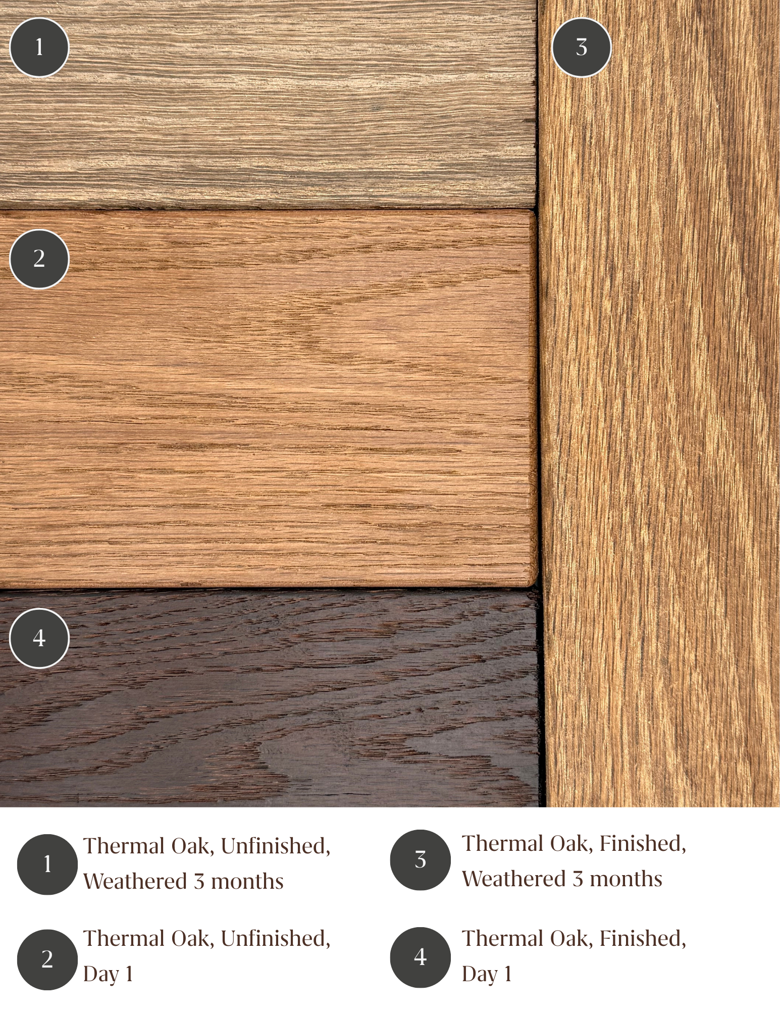 Thermally modified wood will have darker through-color tones. Color will vary with cook temperatures and species. Like standard wood, thermally modified wood, if left untreated, will turn a weathered gray color over time.